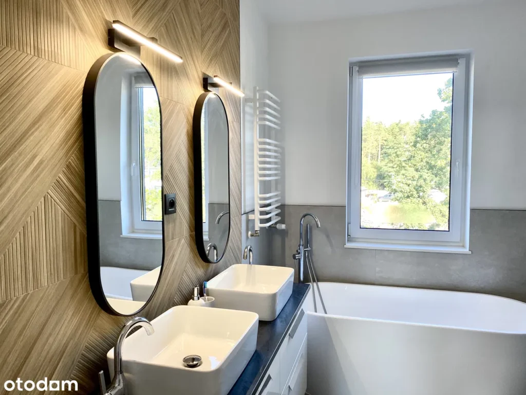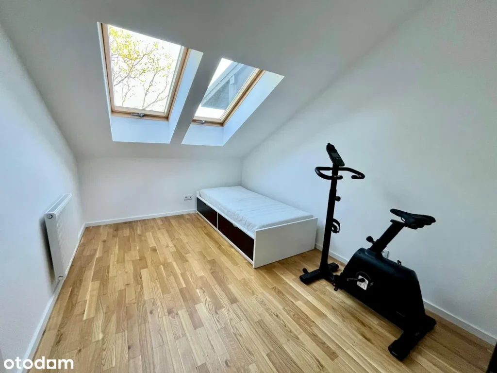 Na drugim poziomie znajduje się przestronna sypialnia z prywatną garderobą, dużym oknem i bezpośrednim wyjściem na taras z widokiem na zieleń – to prawdziwa oaza spokoju. Tuż obok urządzono pokój dziecięcy oraz jasny, klimatyczny pokój ze skosami – idealny jako domowa siłownia, strefa relaksu lub trzecia sypialnia. Całość uzupełnia imponująca łazienka w stylu pokoju kąpielowego: z wolnostojącą wanną, podwójnym lustrem i dyskretnie ukrytym prysznicem.
