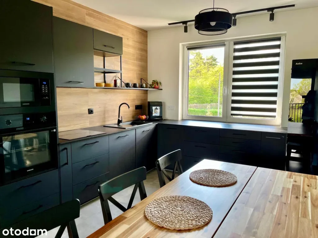 Na pierwszym poziomie znajdziesz nowoczesną kuchnię w matowej czerni z dużym oknem i widokiem na las – gotową, by stać się sercem domu. Tuż obok przestrzeni dziennej zlokalizowany jest przytulny gabinet, który świetnie sprawdzi się jako domowe biuro lub pokój gościnny. Całość uzupełnia elegancka łazienka z prysznicem typu walk-in oraz praktyczna pralniosuszarnia – niewielka, ale z miejscem na wszystko, co potrzebne na co dzień.